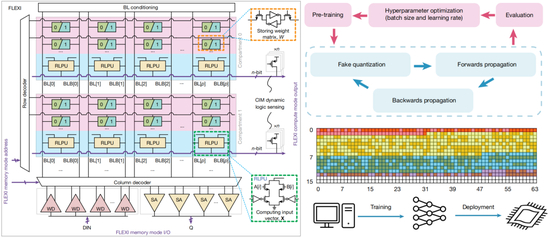 FLEXI存内计算架构电路;结合量化感知训练与贝叶斯优化的双环训练策略;芯片上权重分布可视。并基于此构建出工作电压超低(0.8伏)、硬核